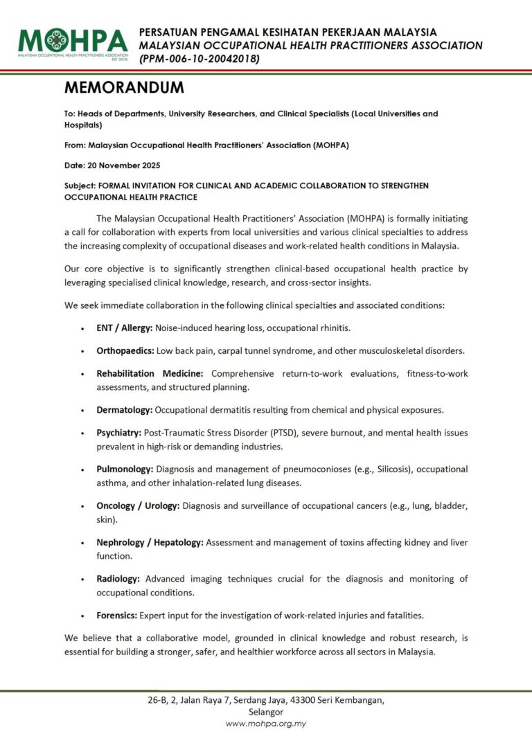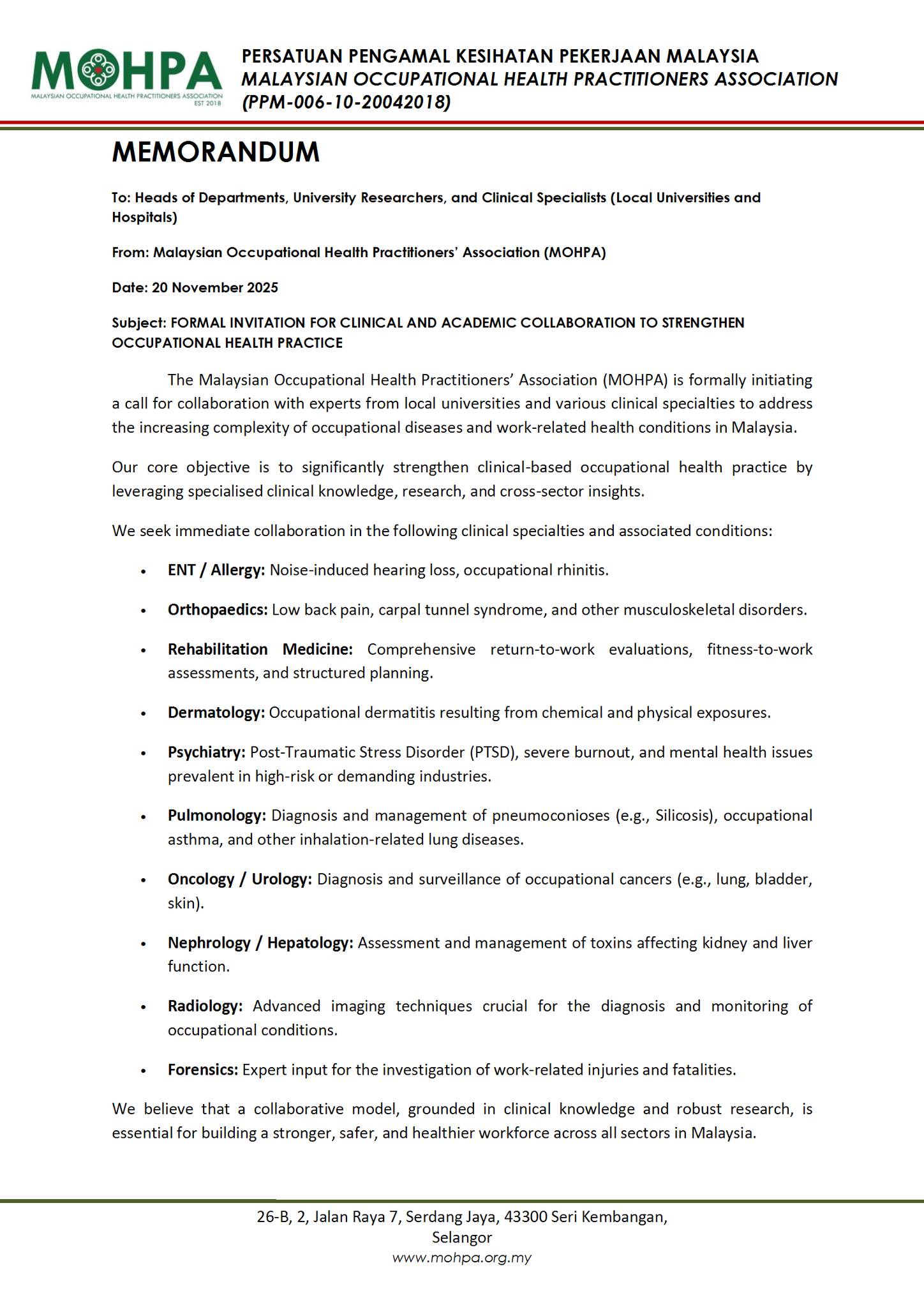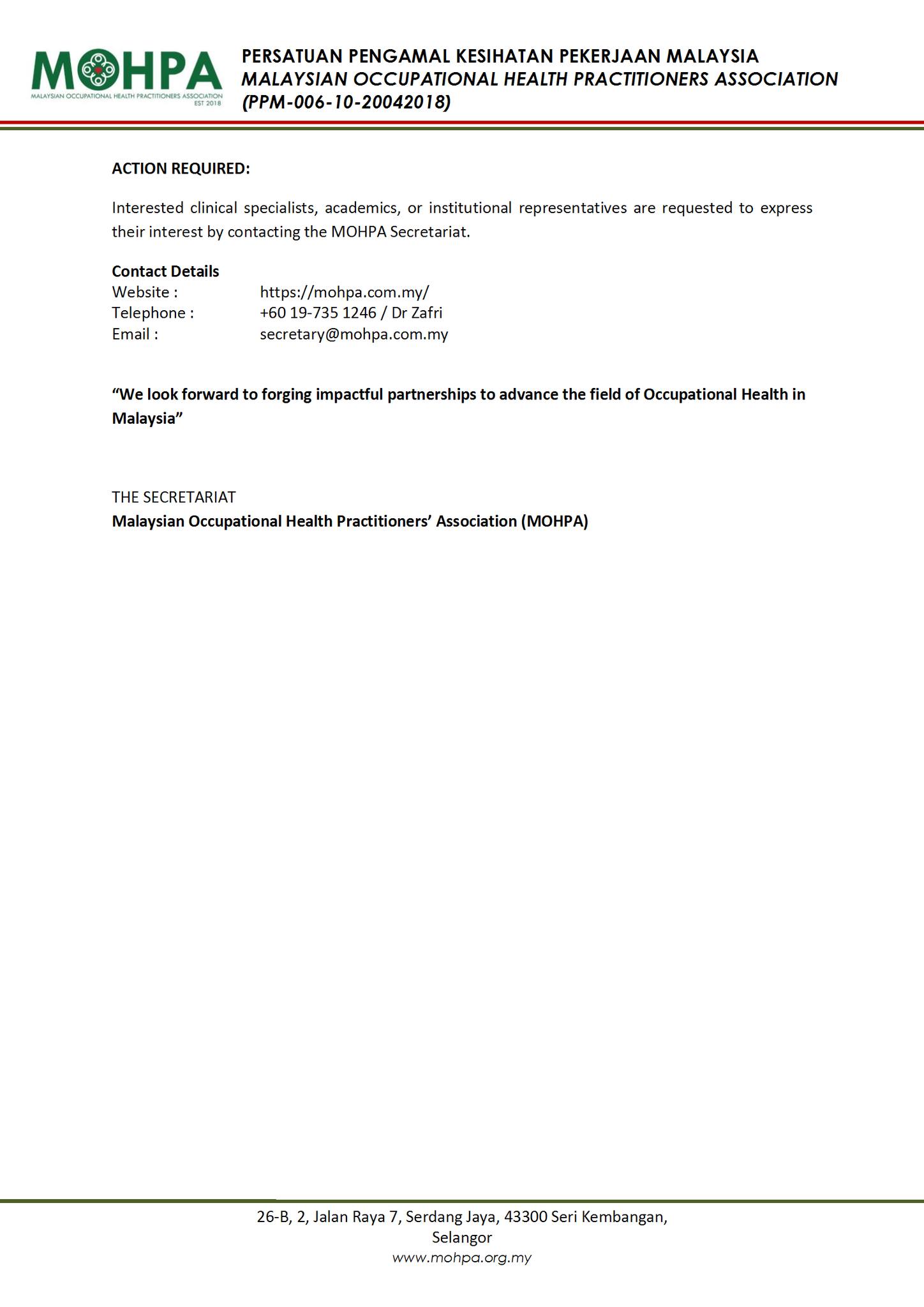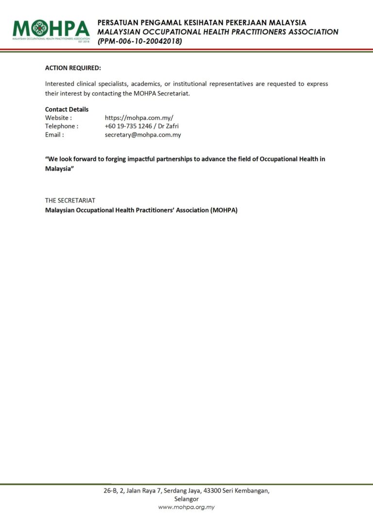 Whether you are a seasoned occupational health practitioner or just starting your career, MOHPA welcomes you to join our community. By becoming a member, you not only gain access to valuable resources and support but also contribute to the advancement of occupational health in Malaysia.